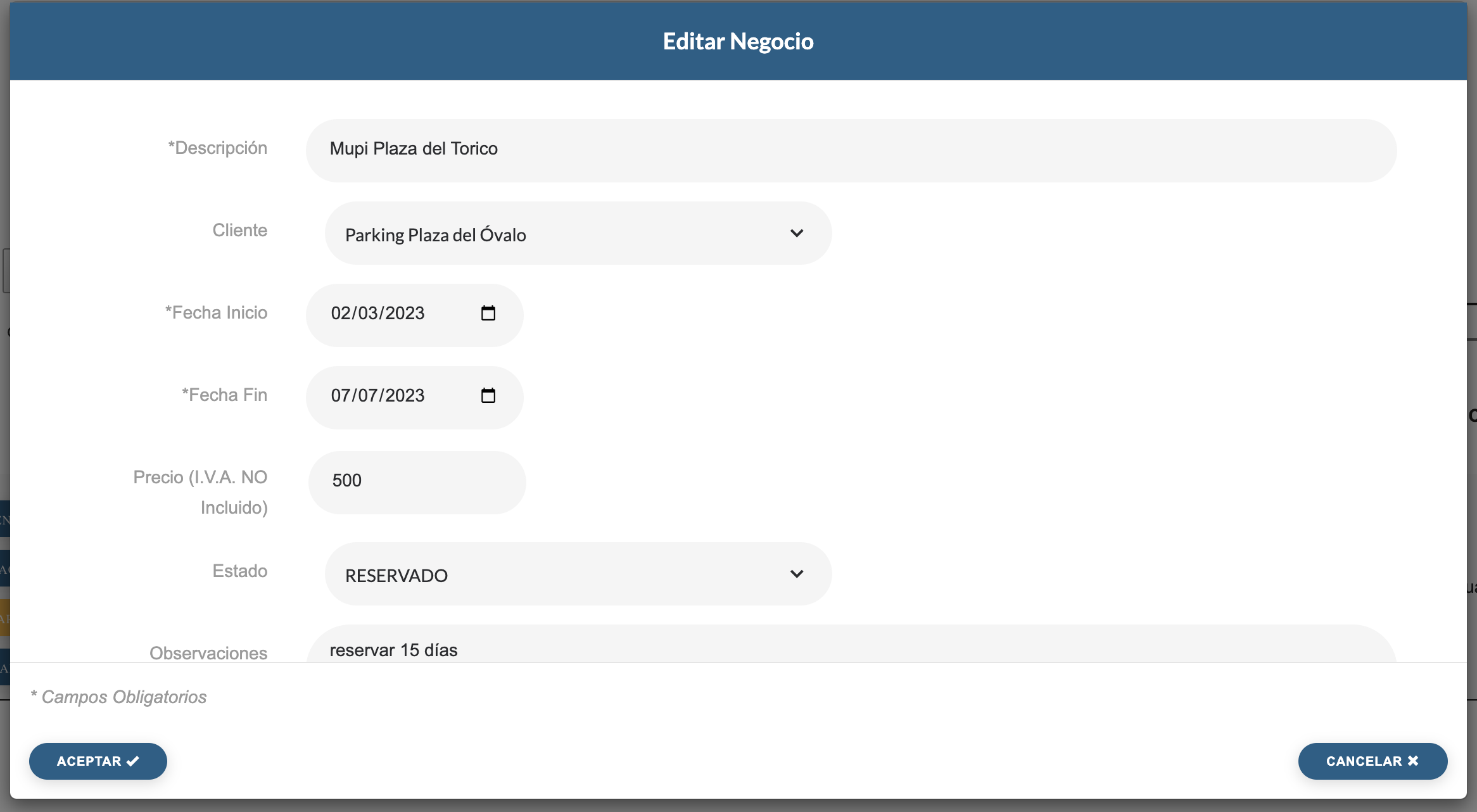 Con todos los campos necesarios: Fecha de inicio y fin, Precio, Estado ...