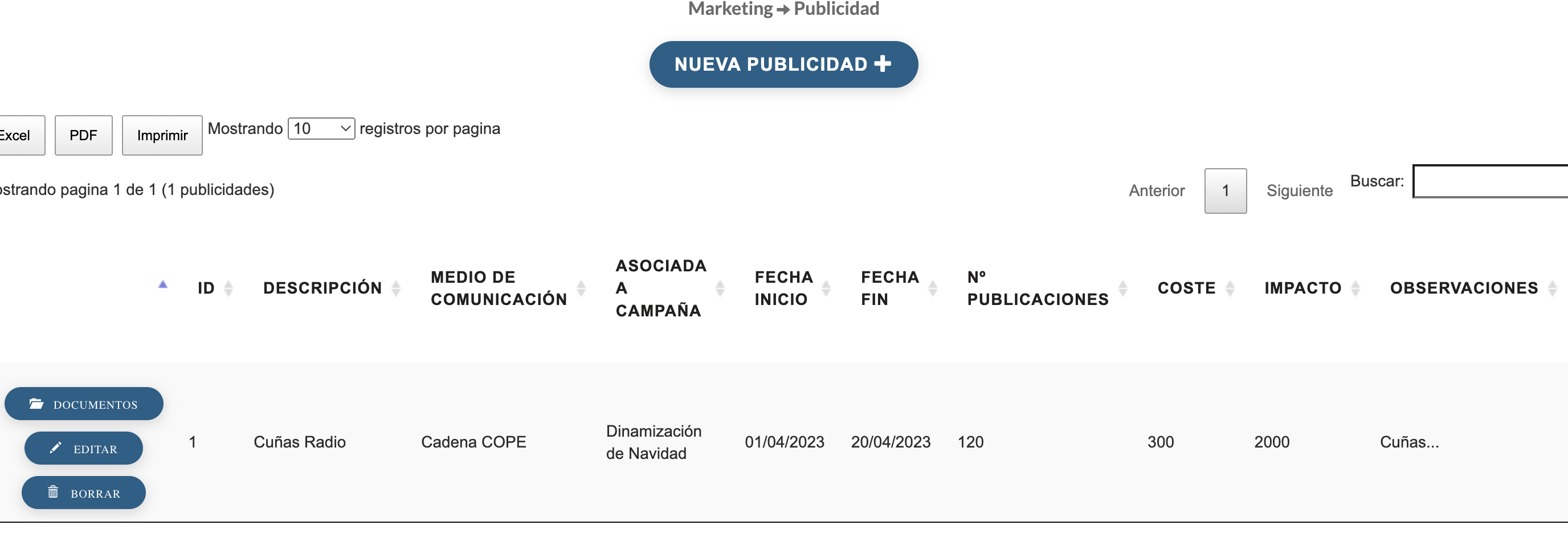 Medio de comunicación, fecha de inicio y fin, coste, impacto ...